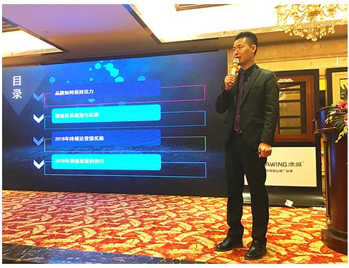 2018年澳威全力打造出多款高附加值产品矩阵,产品为王,严阵以待。会上澳威衣柜事业部营销总监张总分享了各系列新品及营销政策。新品首亮,给了在场经销商极大的信心,在利好政策的刺激下,会场掌声轰动,会议氛围进入一个高点。